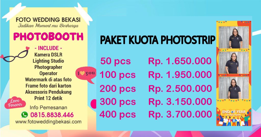 Dapatkan harga sewa photobooth kuota photostrip yang sangat terjangkau di Foto Wedding Bekasi. Buruan booking sebelum kehabisan tanggal!